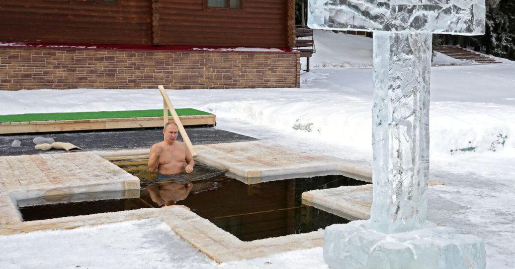 In January 2022, during the Orthodox Epiphany celebration near Moscow, Putin entered an ice-covered river wearing only swimwear at temperatures near −10°C, making the sign of the cross before and after the plunge. This ritual, rooted in ancient baptismal traditions, had also been performed by Putin in 2021 and consistently serves as a public demonstration of his faith and physical endurance.