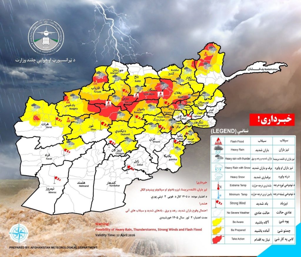 DID Press: Meteorological Authority of Taliban’s Ministry of Transport and Civil Aviation has issued a warning of heavy rainfall expected on Wednesday across 29 provinces, including Kabul.